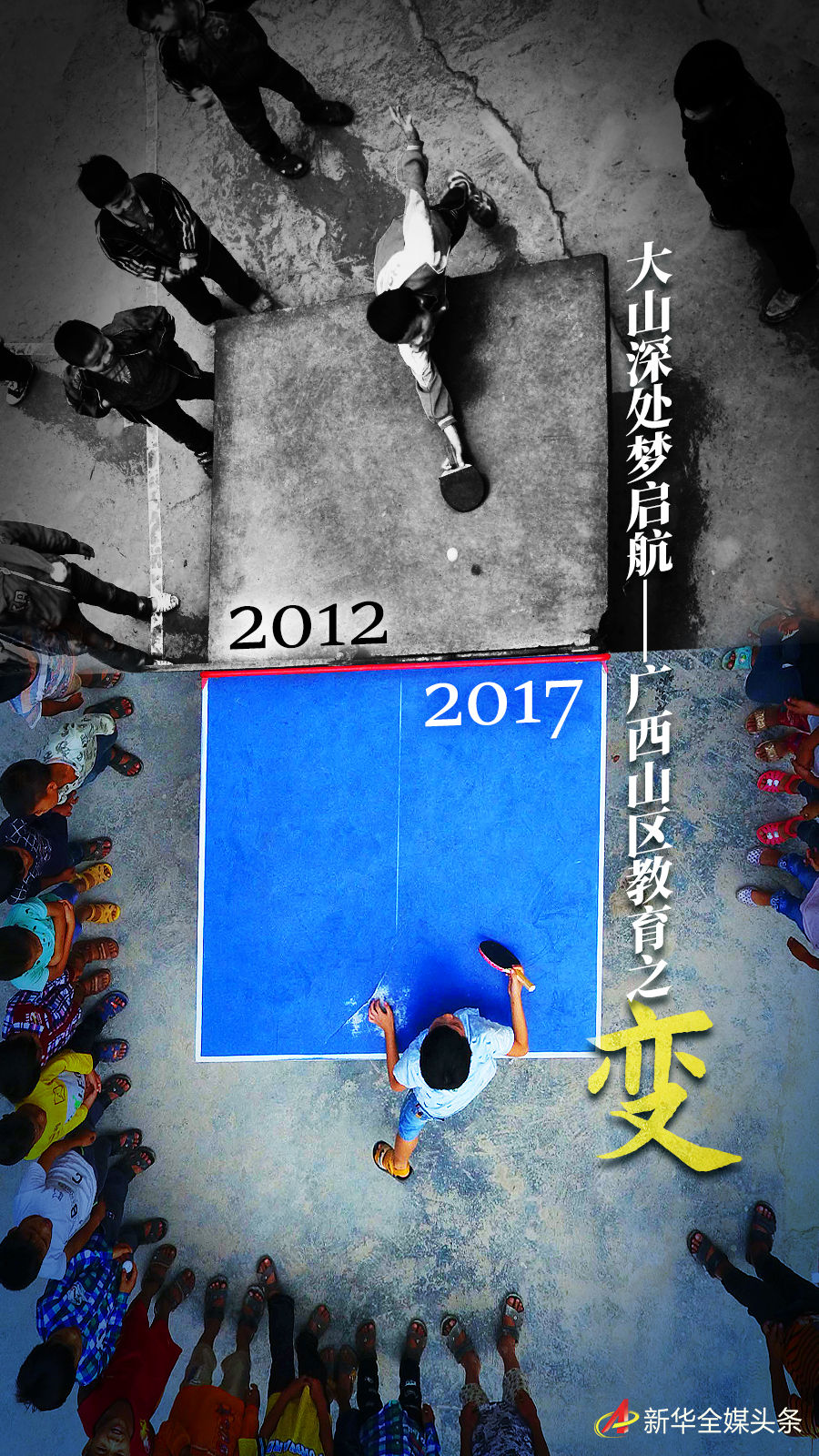 拼版照片:上圖為在廣西大化瑤族自治縣板升鄉(xiāng)弄勇小學(xué),孩子們?cè)诖蚱古仪颍?/span>2017年9月4日攝,無(wú)人機(jī)照片);下圖為在弄勇小學(xué),孩子們?cè)诖蚱古仪颍?/span>2012年12月26日攝)。新華社記者 黃孝邦 攝