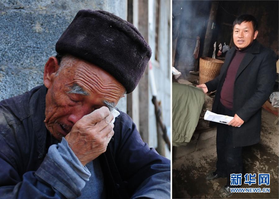 拼版照片:左圖為2019101日,貴州省銅仁市沿河土家族自治縣中寨鎮(zhèn)大坪村村民張信龍談起文偉紅時(shí)傷心落淚(新華社記者胡星攝);右圖為20181227日,文偉紅在沿河土家族自治縣中寨鎮(zhèn)大坪村村民家中走訪。新華社發(fā)