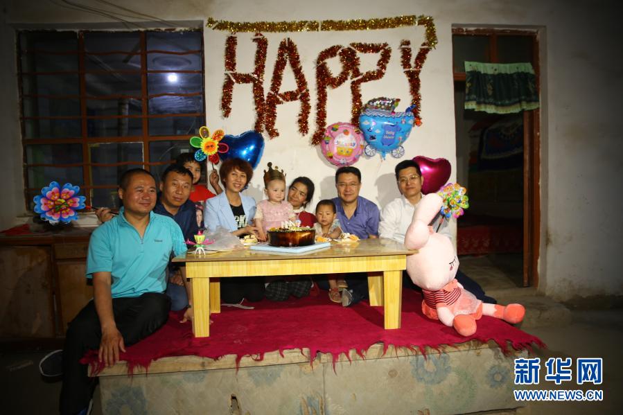 席世明(左二)和其他援疆干部一同給維吾爾族小姑娘小石榴過(guò)生日(資料照片)。新華社發(fā)