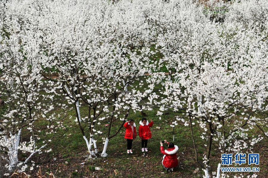 游客在貴州省黔西縣新仁苗族鄉(xiāng)化屋村的櫻桃樹(shù)下留影(2月19日攝)。新華社記者 楊文斌 攝
