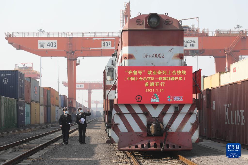 膠州海關(guān)關(guān)員對“齊魯號”歐亞班列上合快線(中國上合示范區(qū)——阿塞拜疆巴庫)線路首班列車進(jìn)行檢查(2021年1月31日攝)。新華社發(fā)(解豪 攝)