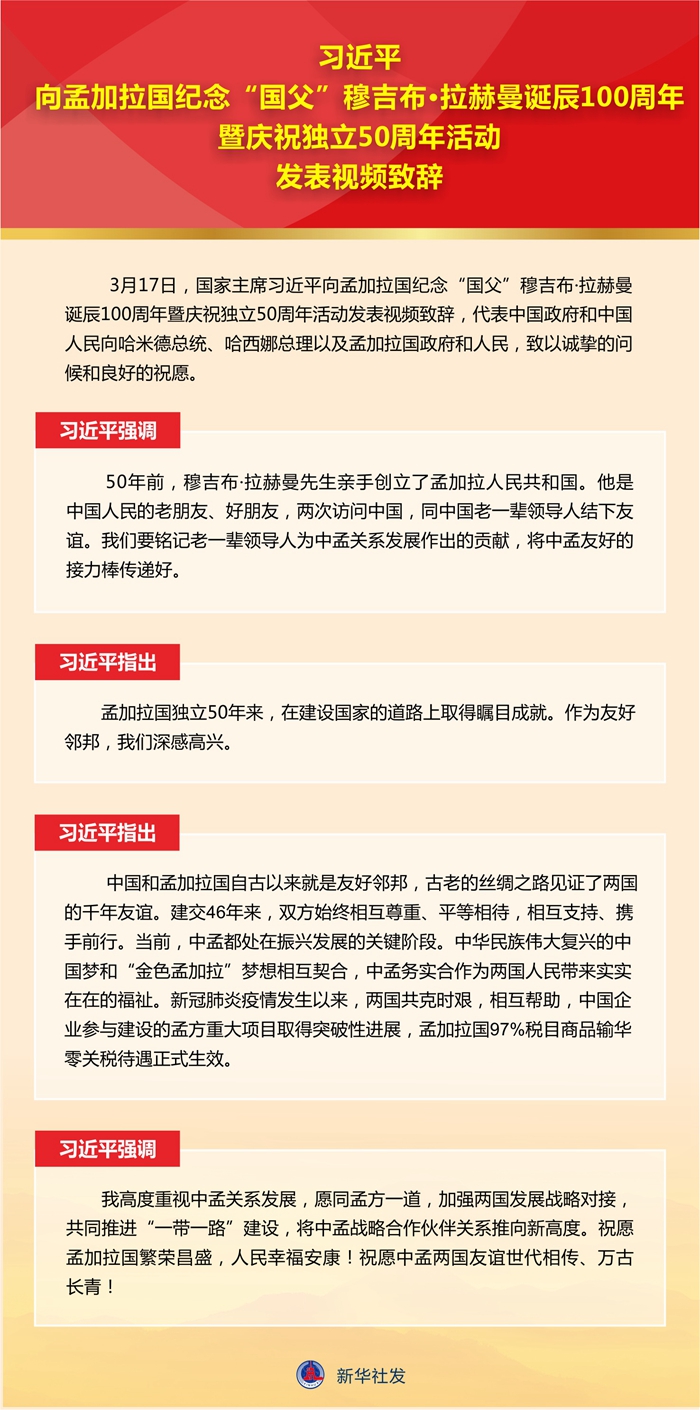 新華社北京 3 月 17 日電 3 月 17 日,國家主席習(xí)近平向孟加拉國紀(jì)念 “ 國父 ” 穆吉布 · 拉赫曼誕辰 100 周年暨慶祝獨(dú)立 50 周年活動發(fā)表視頻致辭,代表中國政府和中國人民向哈米德總統(tǒng)、哈西娜總理以及孟加拉國政府和人民,致以誠摯的問候和良好的祝愿。
