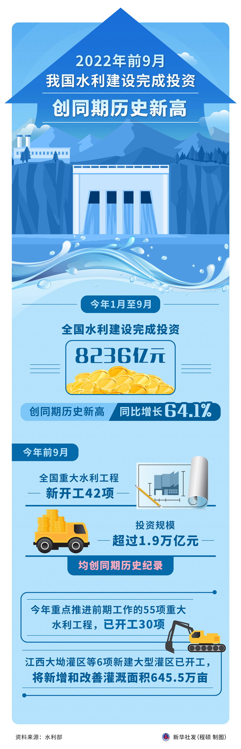據(jù)水利部統(tǒng)計(jì),今年前9月水利建設(shè)落實(shí)投資、完成投資為歷史同期最多:落實(shí)水利建設(shè)投資10571億元,同比增長(zhǎng)53%;完成水利建設(shè)投資8236億元,同比增長(zhǎng)64.1%。