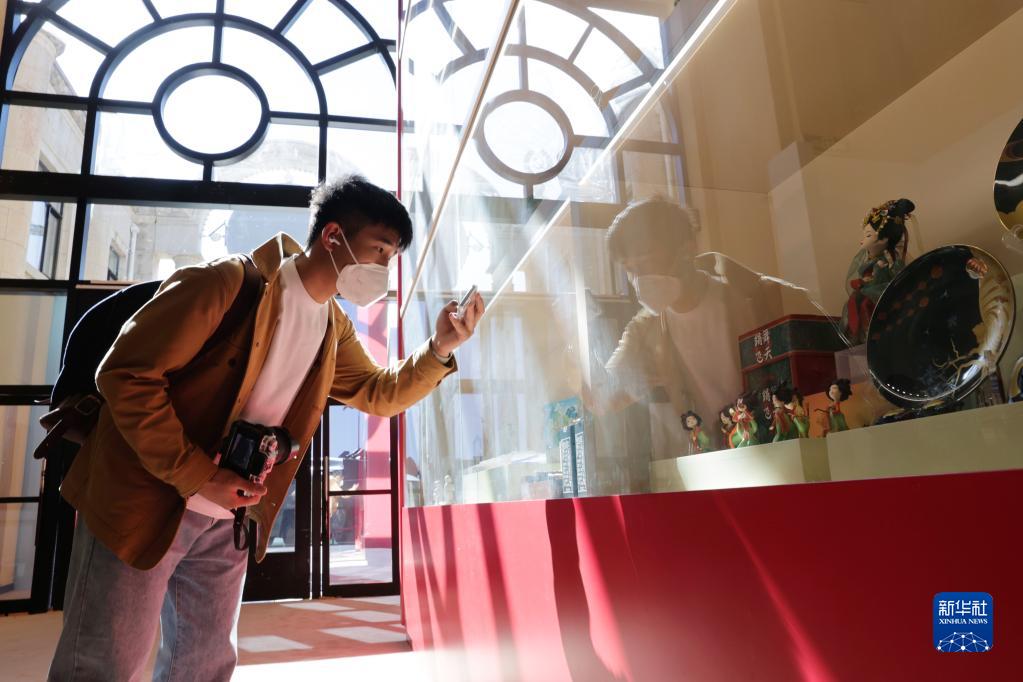 10月10日,觀眾在“奮進新時代”主題成就展第五單元“堅定文化自信 建設社會主義文化強國”展廳拍攝展示代表性非遺作品和文創(chuàng)精品的博古架。新華社記者 張玉薇 攝