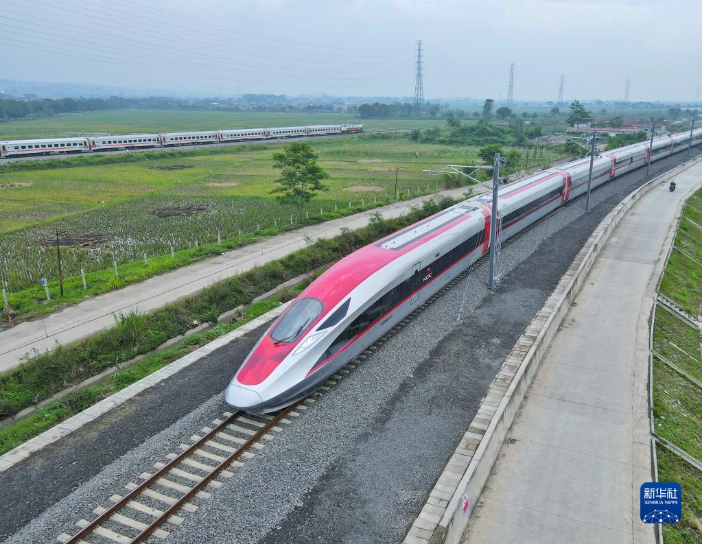 在印度尼西亞西爪哇省萬(wàn)隆市,一列高鐵動(dòng)車(chē)組正在雅萬(wàn)高鐵試驗(yàn)段進(jìn)行熱滑試驗(yàn)(2022年11月9日攝,無(wú)人機(jī)照片)。新華社發(fā)(李培養(yǎng)攝)