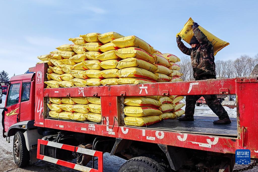 北大荒集團(tuán)五大連池農(nóng)場(chǎng)科技服務(wù)中心工人在裝運(yùn)肥料(2月16日攝)。新華社發(fā)(陸文祥 攝)