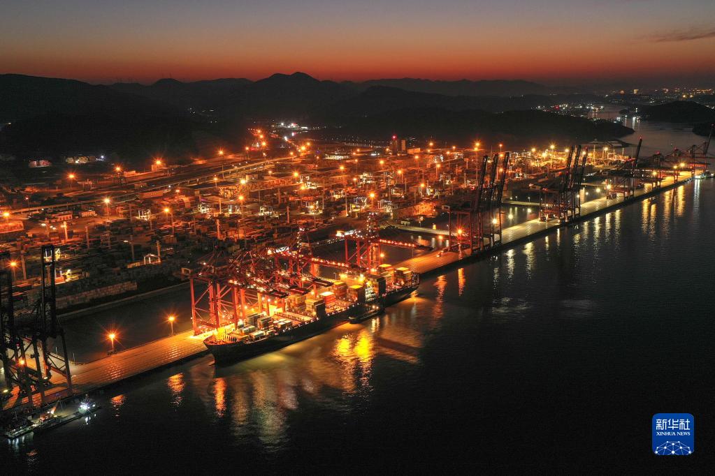 夜幕下,一艘貨輪停靠在寧波舟山港穿山港區(qū)集裝箱碼頭(1月31日攝,無(wú)人機(jī)照片)。新華社記者 黃宗治 攝