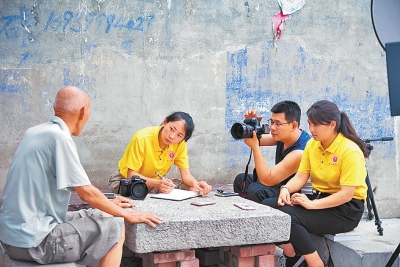 秦國防(右二)和學生們利用暑期到林州市任村鎮(zhèn)前莊,為修渠老人拍攝照片。李若瑜 攝
