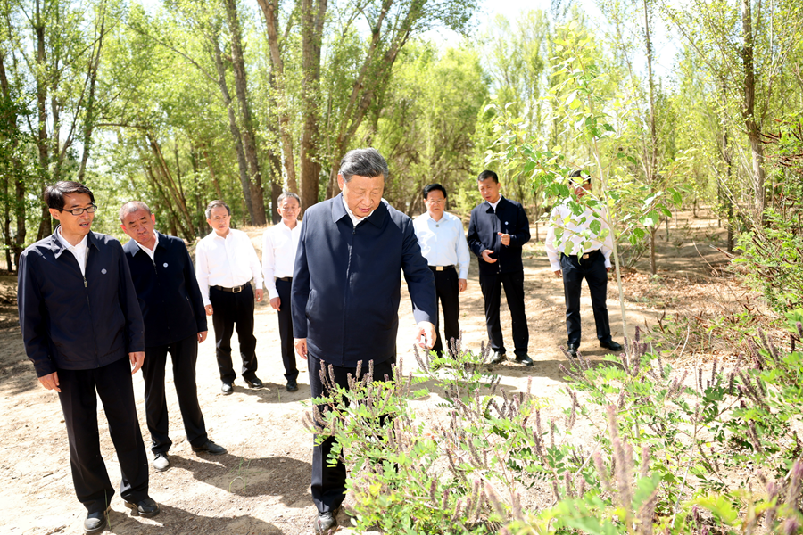 2023年6月5日至6日,中共中央總書(shū)記、國(guó)家主席、中央軍委主席習(xí)近平在內(nèi)蒙古巴彥淖爾考察,并主持召開(kāi)加強(qiáng)荒漠化綜合防治和推進(jìn)“三北”等重點(diǎn)生態(tài)工程建設(shè)座談會(huì)。這是6日上午,習(xí)近平在臨河區(qū)國(guó)營(yíng)新華林場(chǎng)考察。新華社記者 鞠鵬 攝