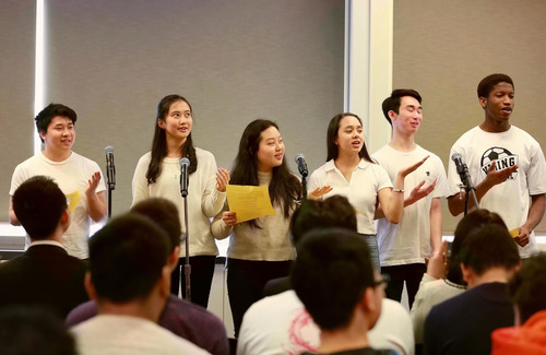2019年4月3日,在美國伊利諾伊州北奈爾斯市,北奈爾斯高中的學生們現(xiàn)場中文朗誦唐代詩人李白的《靜夜思》和孟浩然的《春曉》。