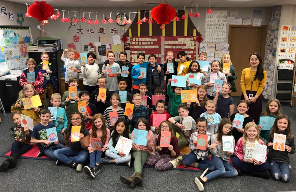 2020年1月21日,在美國猶他州奧勒姆,卡斯卡德小學師生展示為習主席制作的新年賀卡。