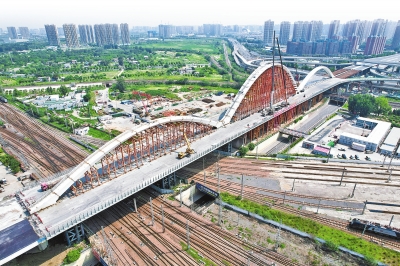 (圖/本報(bào)記者 王錚 攝) ??7月18日,隨著合龍指令的發(fā)出,鄭州新建彩虹橋主橋中跨最后一節(jié)鋼箱拱緩緩放落,橋梁的“彩虹”輪廓初現(xiàn)芳容。 ??“這節(jié)鋼箱拱長(zhǎng)8.4米、寬8米、高2米?!背薪ǚ街需F大橋局彩虹橋項(xiàng)目相關(guān)負(fù)責(zé)人表示,至此,新建彩虹橋的鋼箱拱全部安裝完畢,標(biāo)志著大橋主體結(jié)構(gòu)即將完工,為實(shí)現(xiàn)按期通車目標(biāo)奠定了堅(jiān)實(shí)基礎(chǔ)。 ??被稱為“彩虹橋”的鄭州北環(huán)快速路鐵路跨線大橋,是鄭州北區(qū)東西向的咽喉要道,1994年年底建成通車,由于近年來(lái)交通量逐年增大,橋梁通行壓力較大,該橋經(jīng)過(guò)多次整修仍無(wú)法滿足市民出行需求,2019年拆除重建。 ??據(jù)介紹,鄭州新建彩虹橋上部結(jié)構(gòu)為下承式三跨連續(xù)單拱肋鋼箱系桿拱橋,重2000多噸。預(yù)計(jì)新橋建成后,將大大緩解北三環(huán)東西向的交通壓力,對(duì)于完善鄭州的快速路網(wǎng)結(jié)構(gòu),加強(qiáng)中心城區(qū)與周邊區(qū)域的聯(lián)系等具有重要意義。(記者 李林)