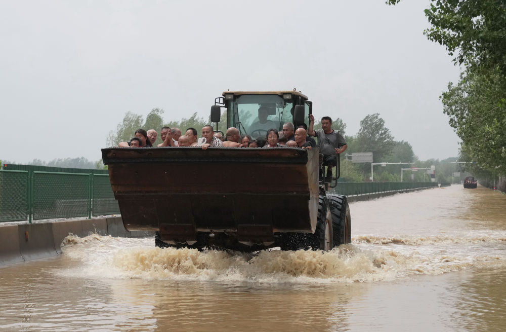 7月31日,在河北省邢臺市寧晉縣,救援人員使用工程機(jī)械設(shè)備轉(zhuǎn)運(yùn)北沙良村村民。新華社記者 楊世堯 攝