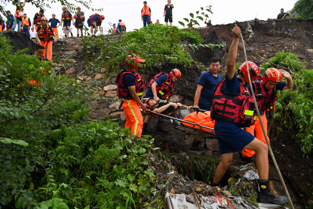 8月1日,在北京市門頭溝區(qū)水峪嘴村,在此增援的大興區(qū)消防救援支隊(duì)消防員在轉(zhuǎn)運(yùn)被困受傷的村民。新華社記者 鞠煥宗 攝