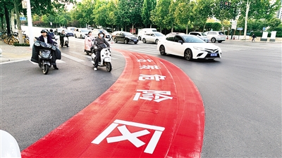 ????近日,市民在南三環(huán)與第五大街交叉口發(fā)現(xiàn),路口4個方向非機動車道前都用紅漆施劃出了一段月牙形狀的區(qū)域,上面寫了“右轉(zhuǎn)危險區(qū)”五個大字。這是怎么回事呢?