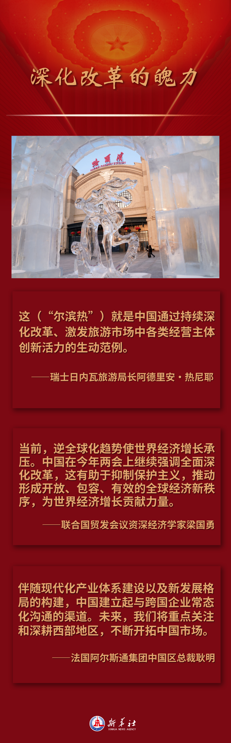 ??今年年初,“爾濱熱”火出國(guó)門(mén),引來(lái)歐洲冰雪勝地瑞士旅游部門(mén)的“隔空互動(dòng)”。瑞士日內(nèi)瓦旅游局長(zhǎng)阿德里安·熱尼耶說(shuō),這就是中國(guó)通過(guò)持續(xù)深化改革、激發(fā)旅游市場(chǎng)中各類(lèi)經(jīng)營(yíng)主體創(chuàng)新活力的生動(dòng)范例。“我很佩服哈爾濱,政府能與整個(gè)市場(chǎng)一同努力挖掘冰雪旅游資源、改革完善相關(guān)機(jī)制,讓冬季活動(dòng)變得如此多彩!”