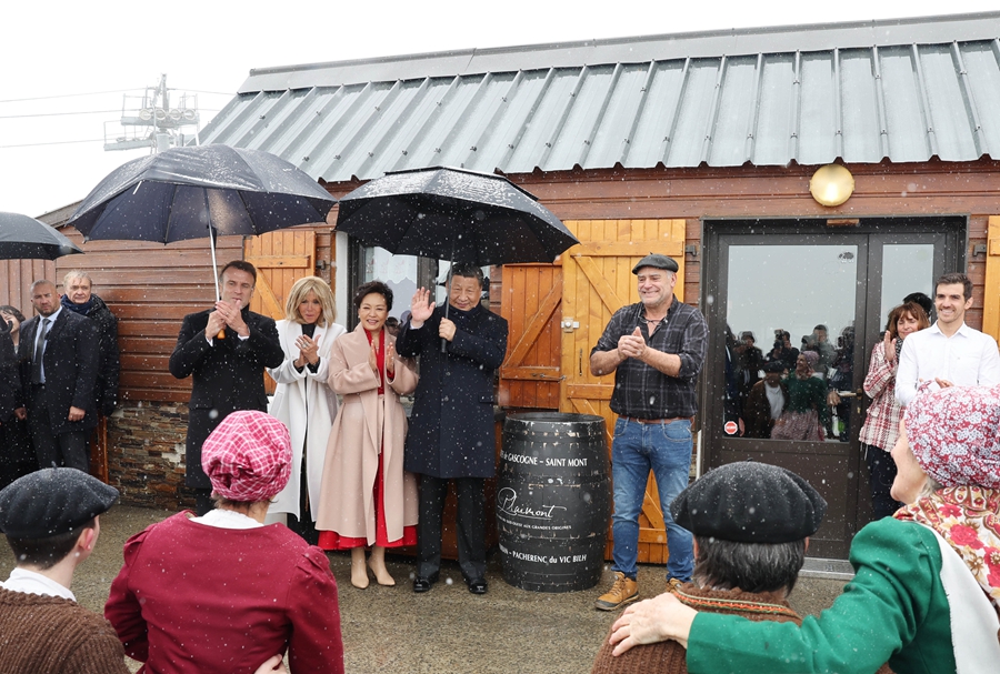 ??當(dāng)?shù)貢r(shí)間5月7日,應(yīng)法國總統(tǒng)馬克龍?zhí)貏e邀請(qǐng),國家主席習(xí)近平乘專機(jī)來到法國西南部上比利牛斯省訪問。在圖爾馬萊山口“牧羊人驛站”,習(xí)近平和夫人彭麗媛同馬克龍和夫人布麗吉特共同欣賞當(dāng)?shù)卮迕癖硌莸木哂袧庥裟戏L(fēng)情的牧羊人之舞。新華社記者 姚大偉 攝
