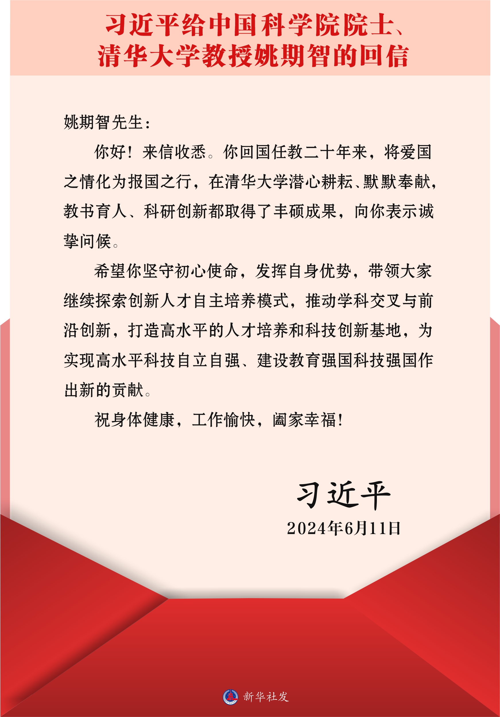 ??新華社北京6月12日電 近日,中共中央總書(shū)記、國(guó)家主席、中央軍委主席習(xí)近平給中國(guó)科學(xué)院院士、清華大學(xué)教授姚期智回信,向他致以誠(chéng)摯問(wèn)候并提出殷切希望。