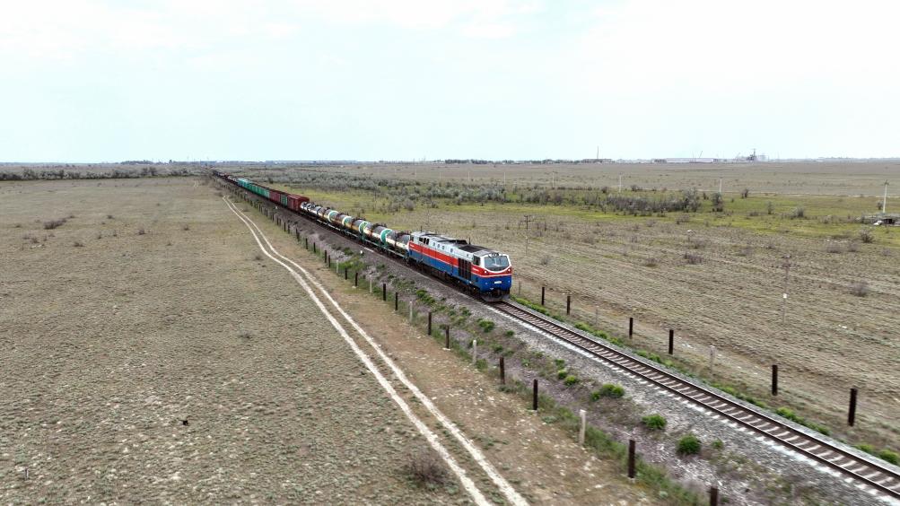 ??2023年5月12日,在哈薩克斯坦阿拉木圖附近,貨運列車馳騁于阿拉木圖與中國霍爾果斯間(無人機照片)。新華社發(fā)(奧斯帕諾夫攝)