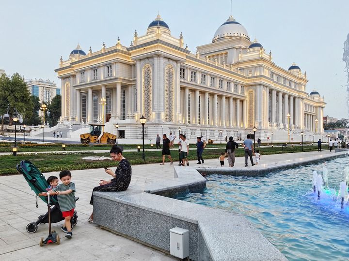 ??2024年6月29日,在塔吉克斯坦首都杜尚別,人們在塔吉克斯坦議會大樓前休閑。新華社記者 申宏 攝