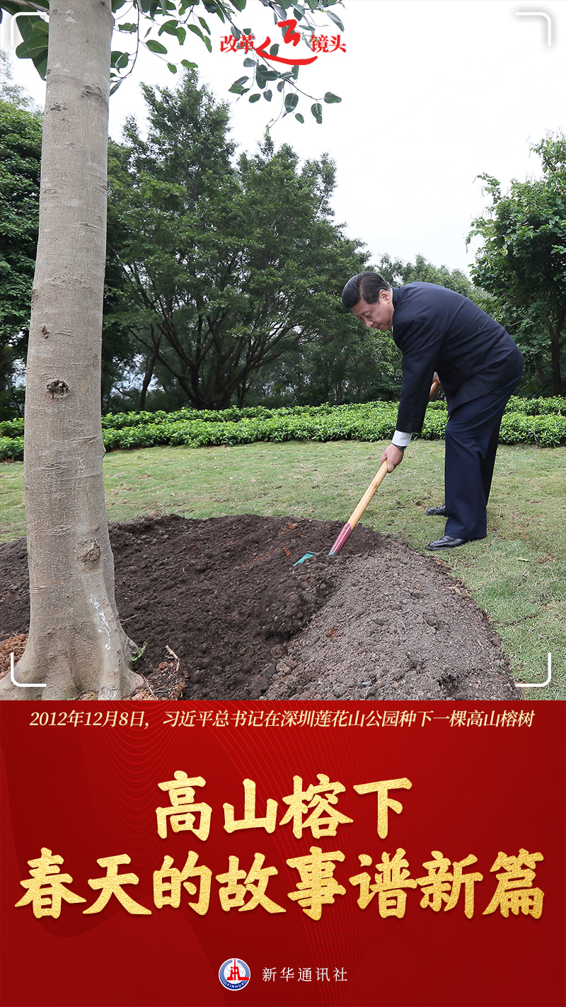 ??深圳蓮花山,一棵迎風(fēng)而立的高山榕,挺拔茂盛。樹(shù)前一方花崗石碑上,鐫刻著“習(xí)近平手植樹(shù)”。