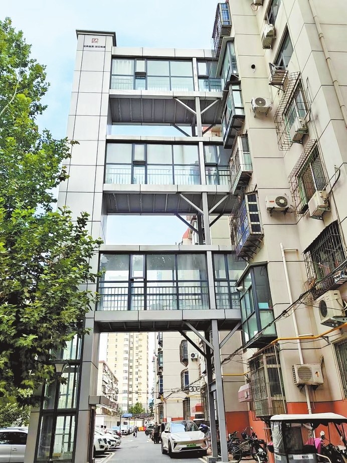 位于鄭州市紫荊山路與順河路交叉口附近的順河路43號院內(nèi),老舊樓加裝的跨路連廊電梯。 本報(bào)記者 韓春光 攝